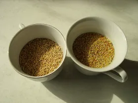 Herausgekommen dabei sind zwei Tassen gefüllt mit Hirsesamen, links die Silberhirse und rechts die Rote Hirse.